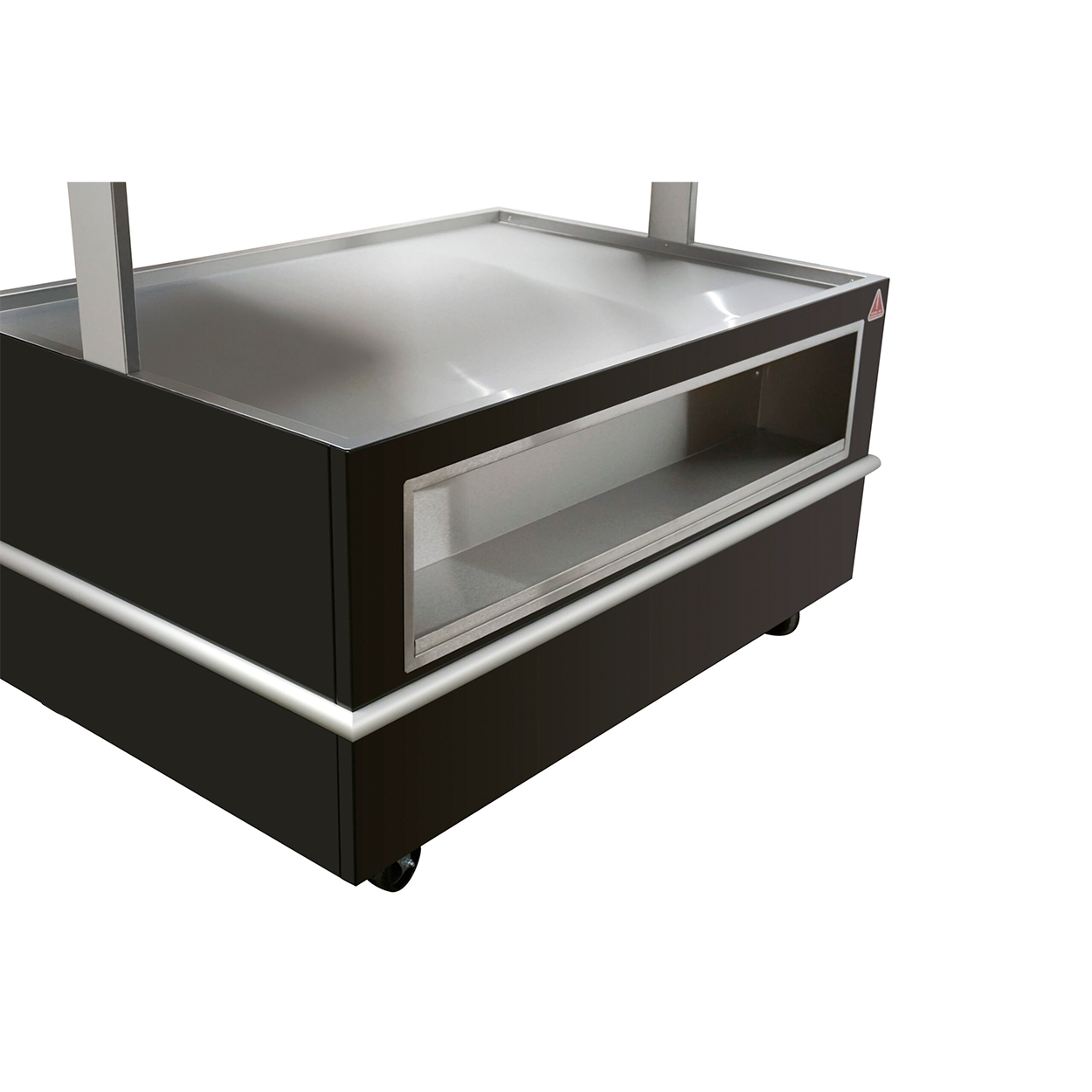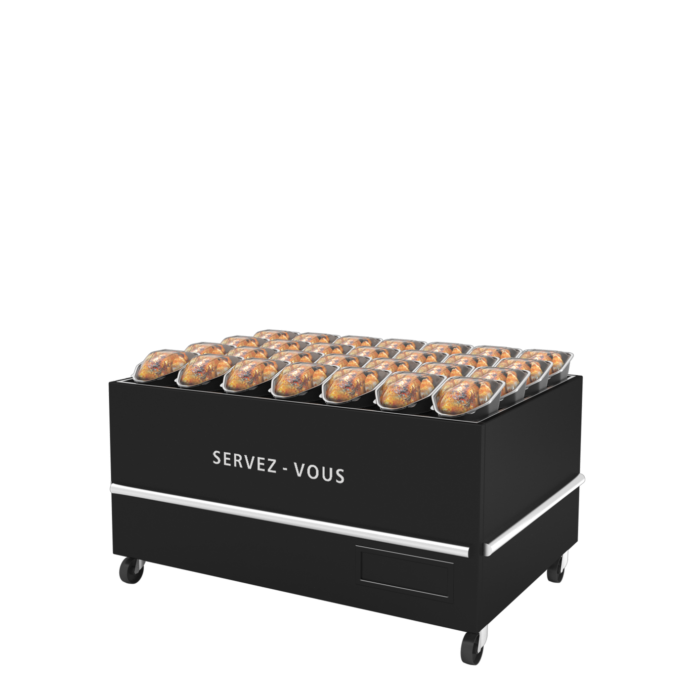 En libre-service et disposée dans tout type de commerce, ce meuble mobile est un atout majeur en favorisant des achats d’impulsion pour les produits chauds emballés (poulets rôtis, viandes grillées diverses, pommes de terre, etc..)
